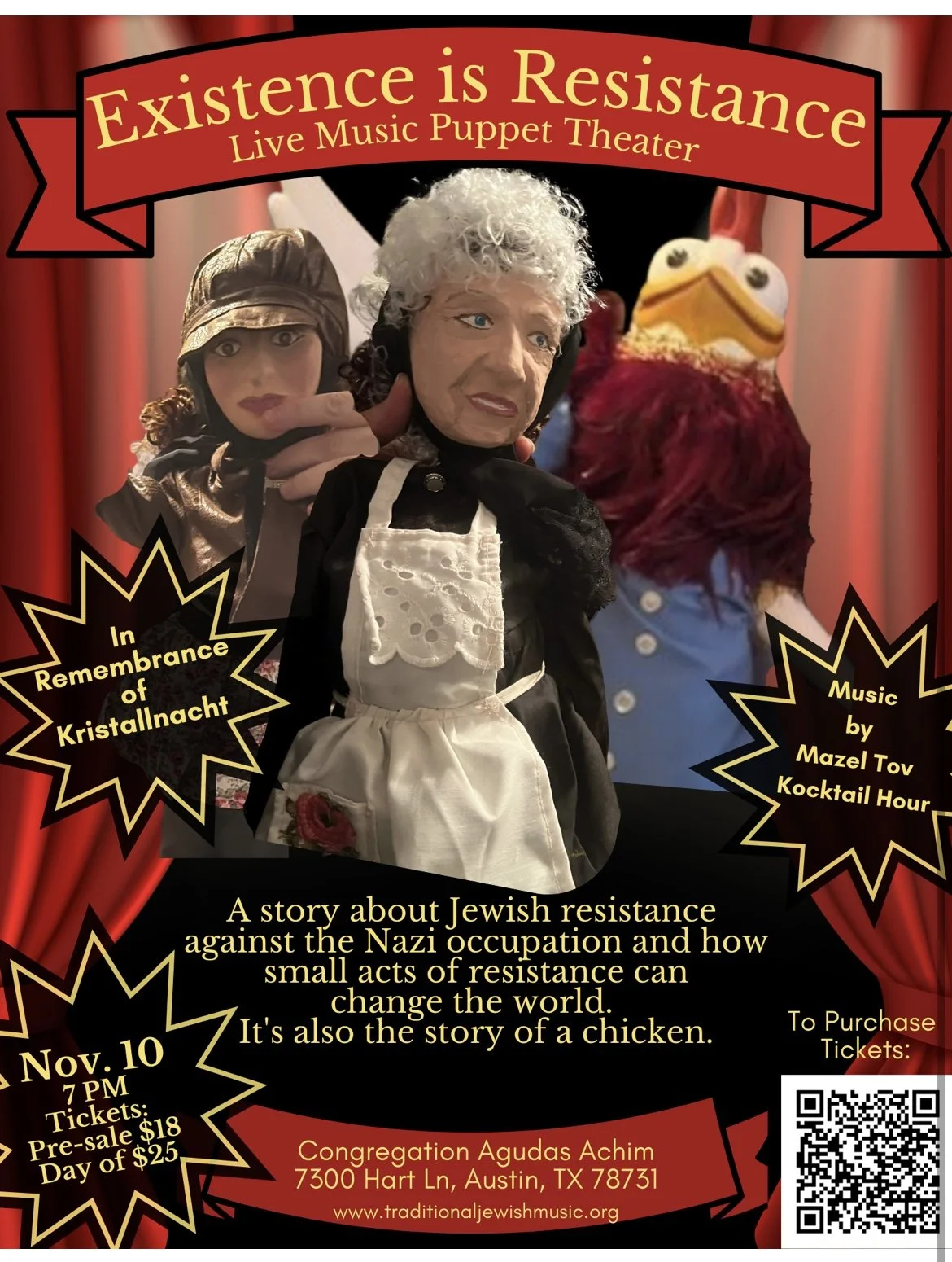 One chicken’s story of partisanship and resistance. Hand made puppets meet masterful retelling of a shared story of many survivors and fighters. This puppet show crosses the bounds of storytelling of the past and current day, a poignant story that translates seamlessly to the realities of today. Learn, think, and share ideas inspired by this brave and wise little chicken’s narration of true, breathtaking stories of love, fighting, culture, music and existence as a means of resistance. Afterall existence IS resistance.